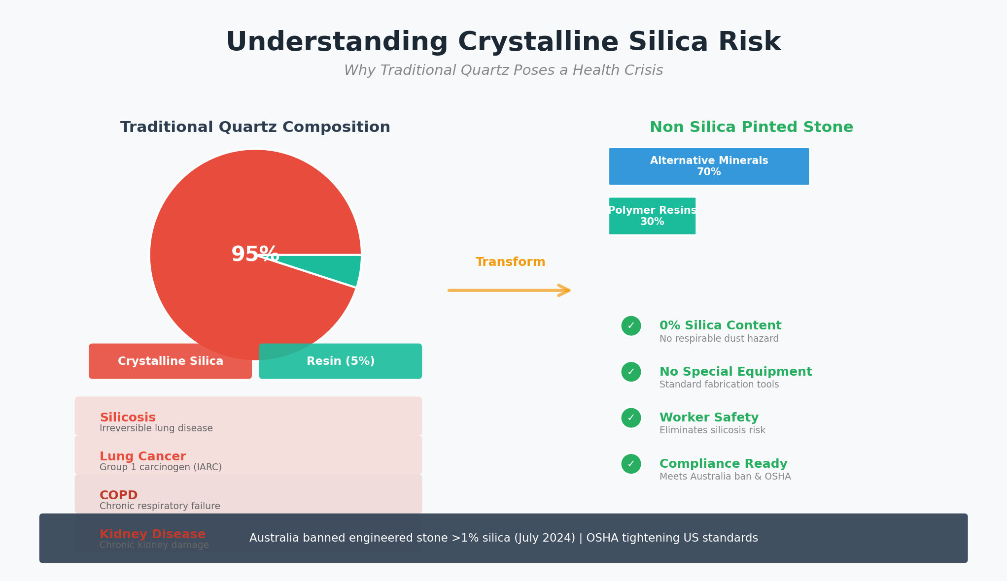 The critical point: While engineered quartz is safe for end-users in homes and commercial spaces, the fabrication and installation processes release respirable silica dust that poses severe health risks to workers. This is why regulatory bodies worldwide are taking action.