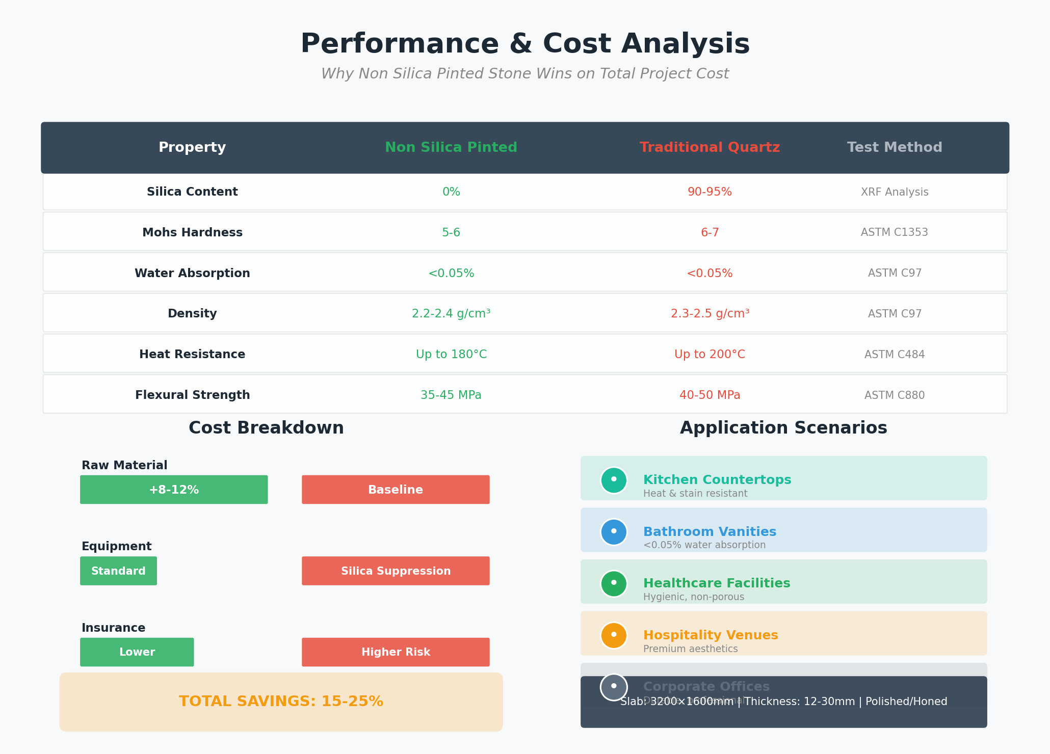 - Because silica-free surfaces require no specialized suppression equipment, fabrication costs decrease by 15-25% compared to traditional quartz processing.